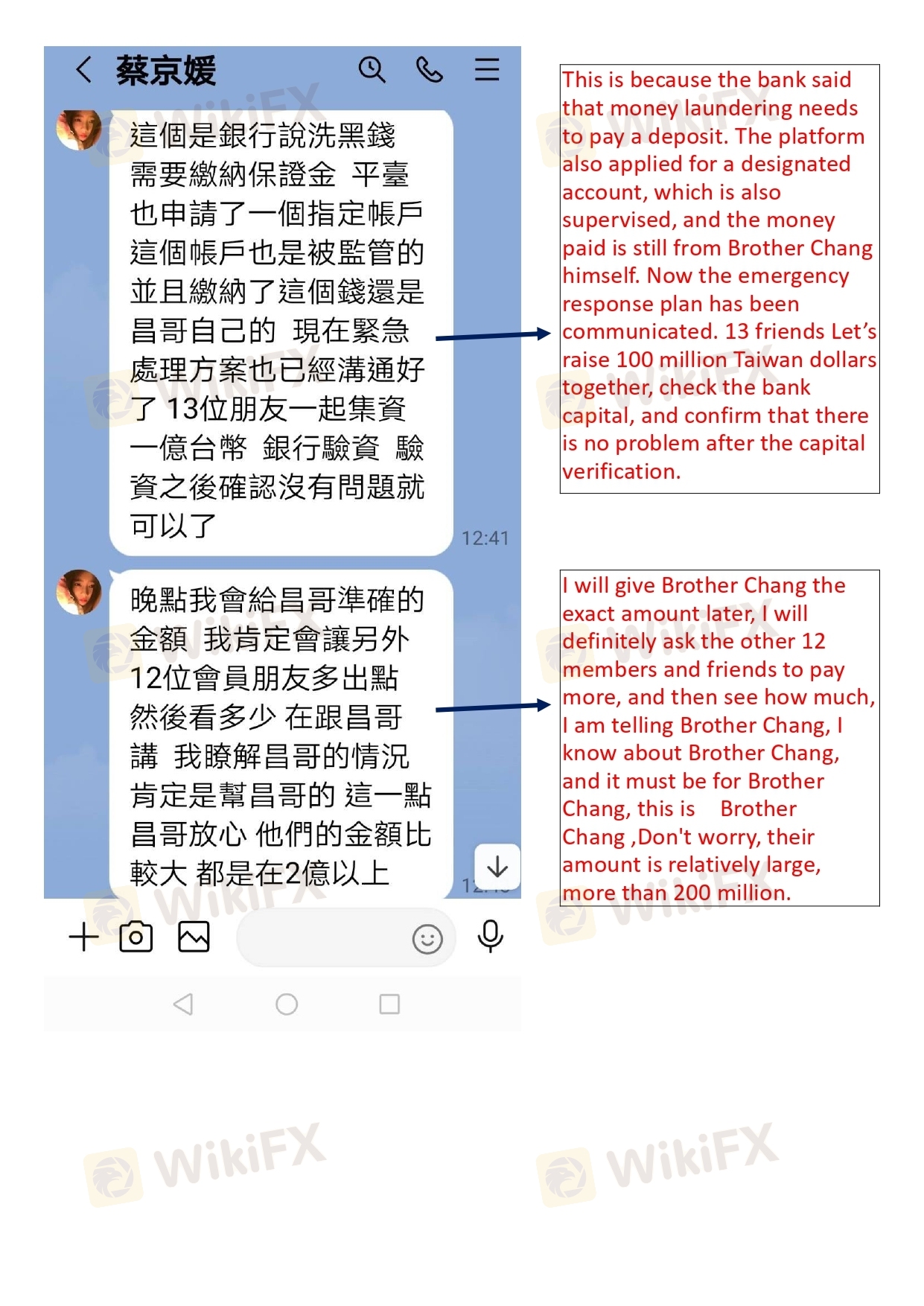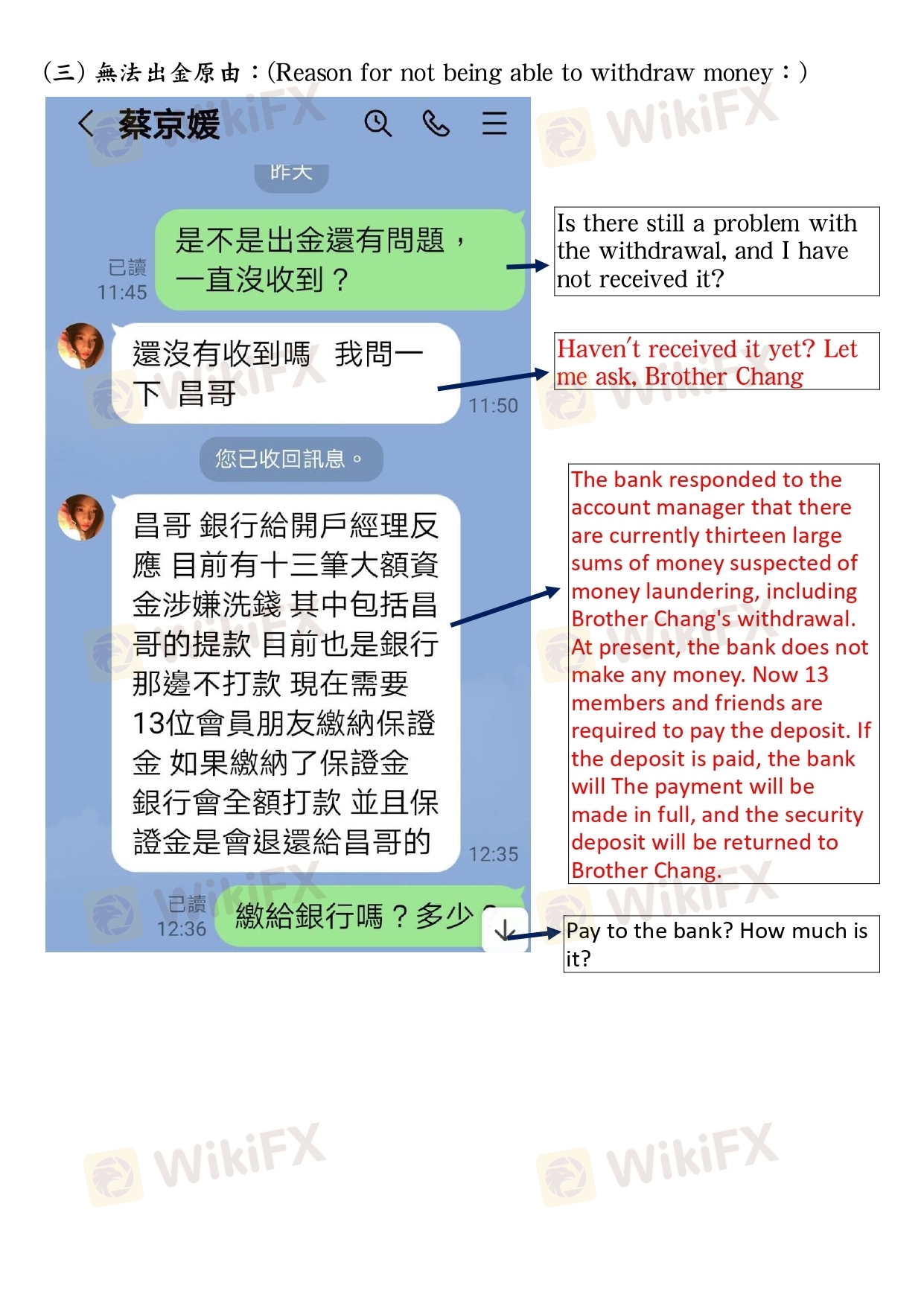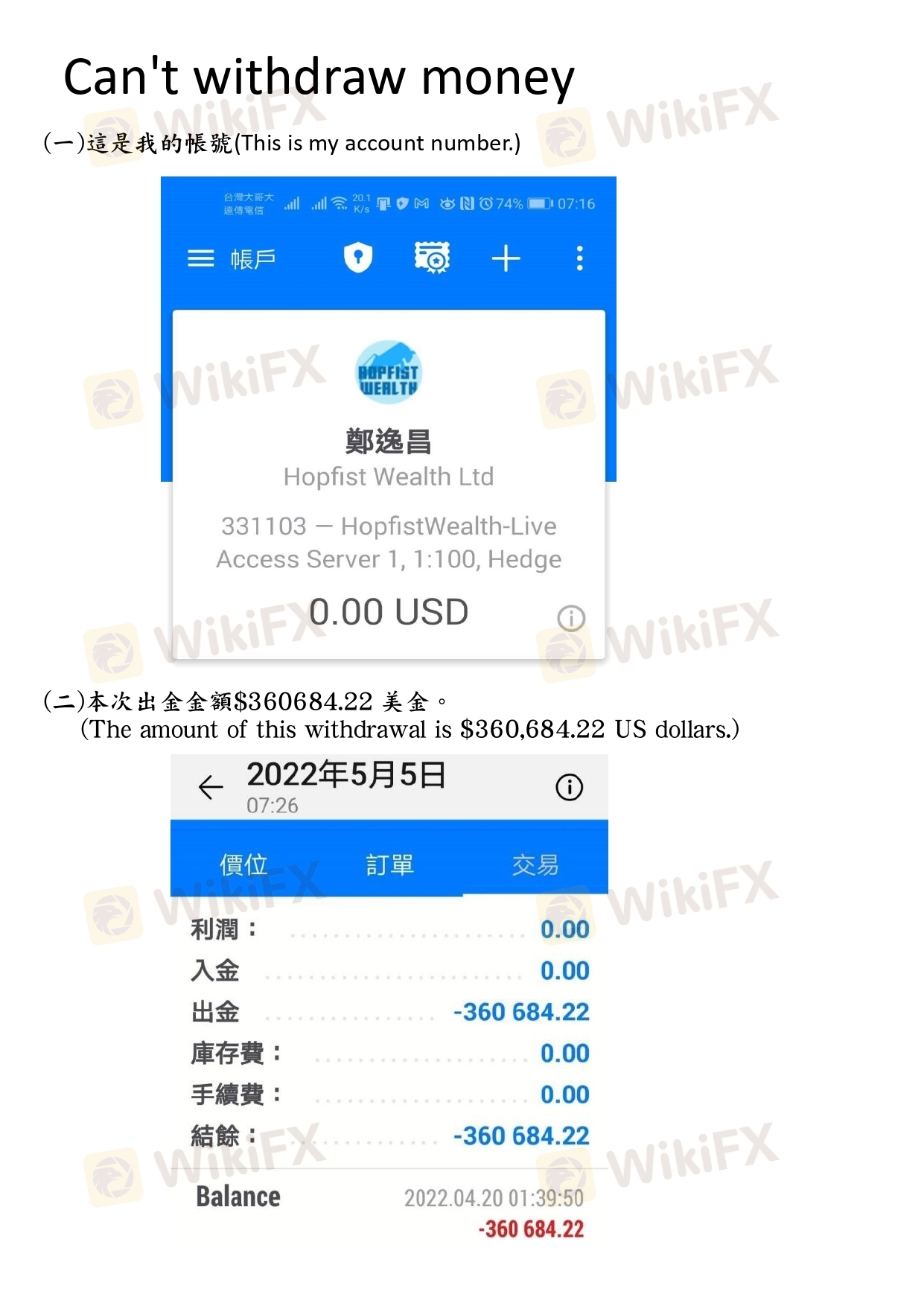 4月20日申請出金$360684.23美金, 因分成問題(入金前未說明分成方式為何) 要求本人給付3400000元新臺幣至公司指定帳戶內, 因本次操作事前已入金1700000元,僅剩900000元存款,與助理秘書協議後, 同意900000元 新台幣入帳後出金,剩餘分成待出金到帳後補還, 本人即將該筆金額匯入其指定的帳戶內。數日後, 因本人遲未收到該筆出金, 再次詢問助理秘書 ,回覆要求本人須再繳 1600000元保證金供銀行驗資, 該筆款項本人已無力支付 ,對方遲遲不肯出金, 生活己陷入困境。