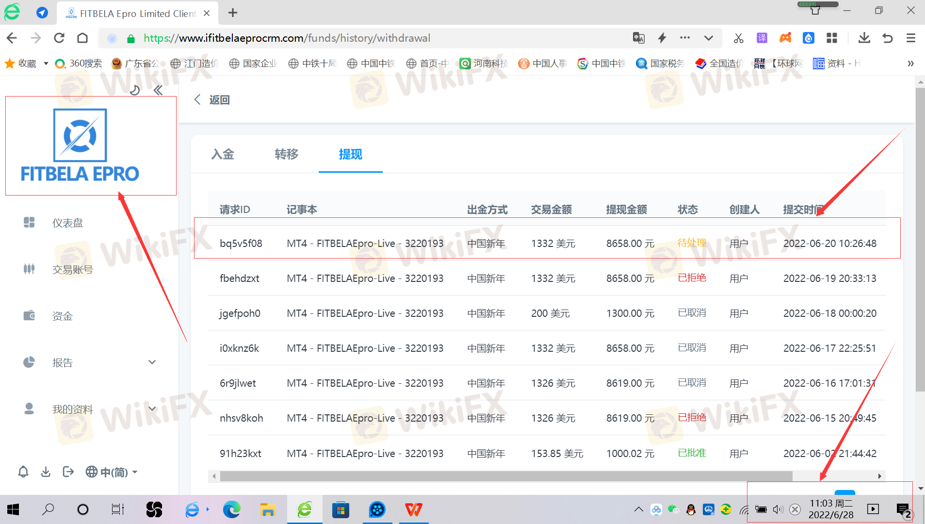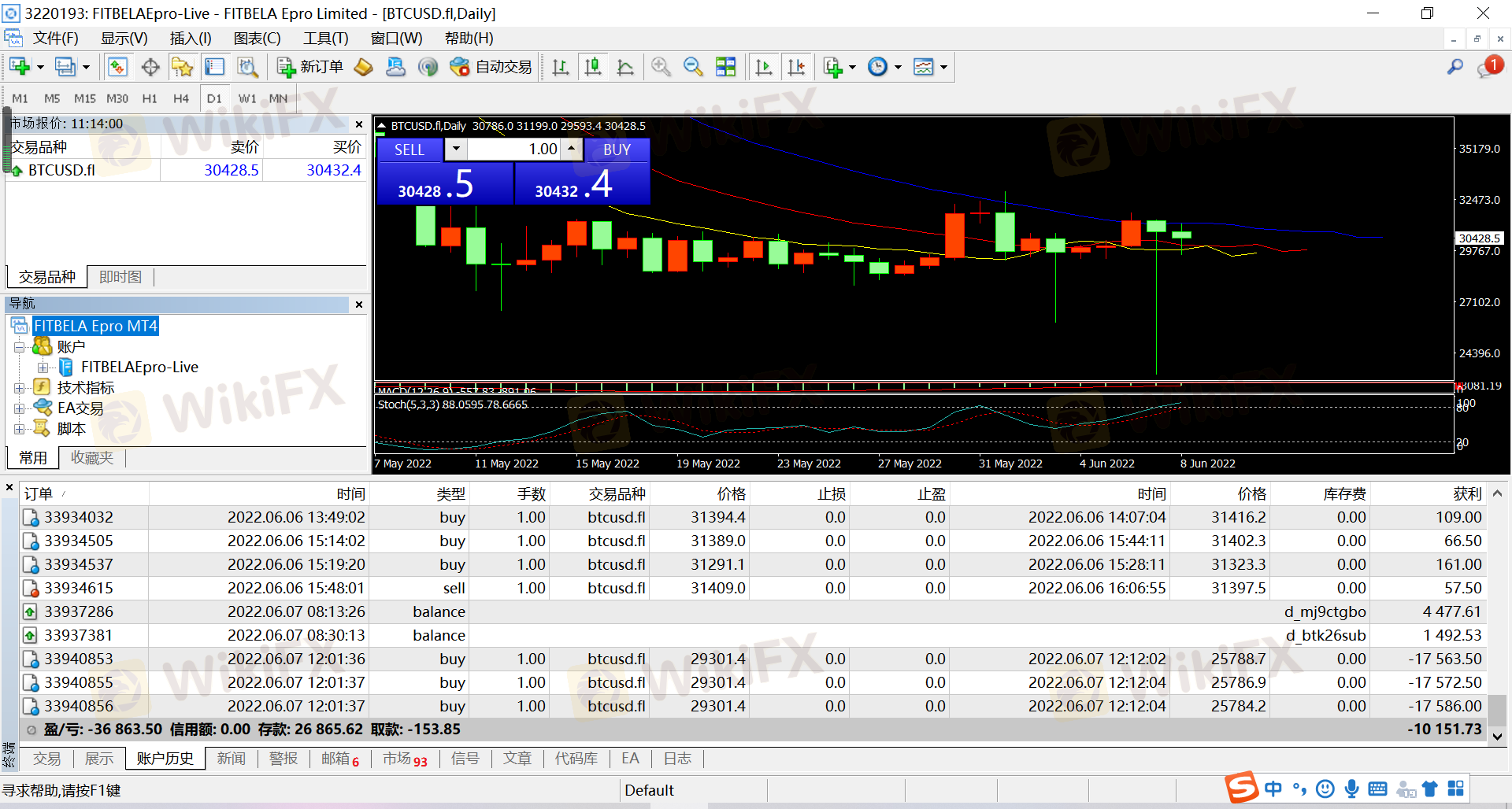 2022年4月20日左右被自稱孔杰助理的涵涵添加了QQ,先以薦股取得信任后誘導開通FITBELA EPRO賬號,買賣比特幣交易,在2022年6月7日晚8點跟單操作被惡意爆倉,黑掉本金,后通過助理涵涵申請了賬戶清零,2022年6月15日賬戶有一筆入金,隨后申請出金,一直無法出金