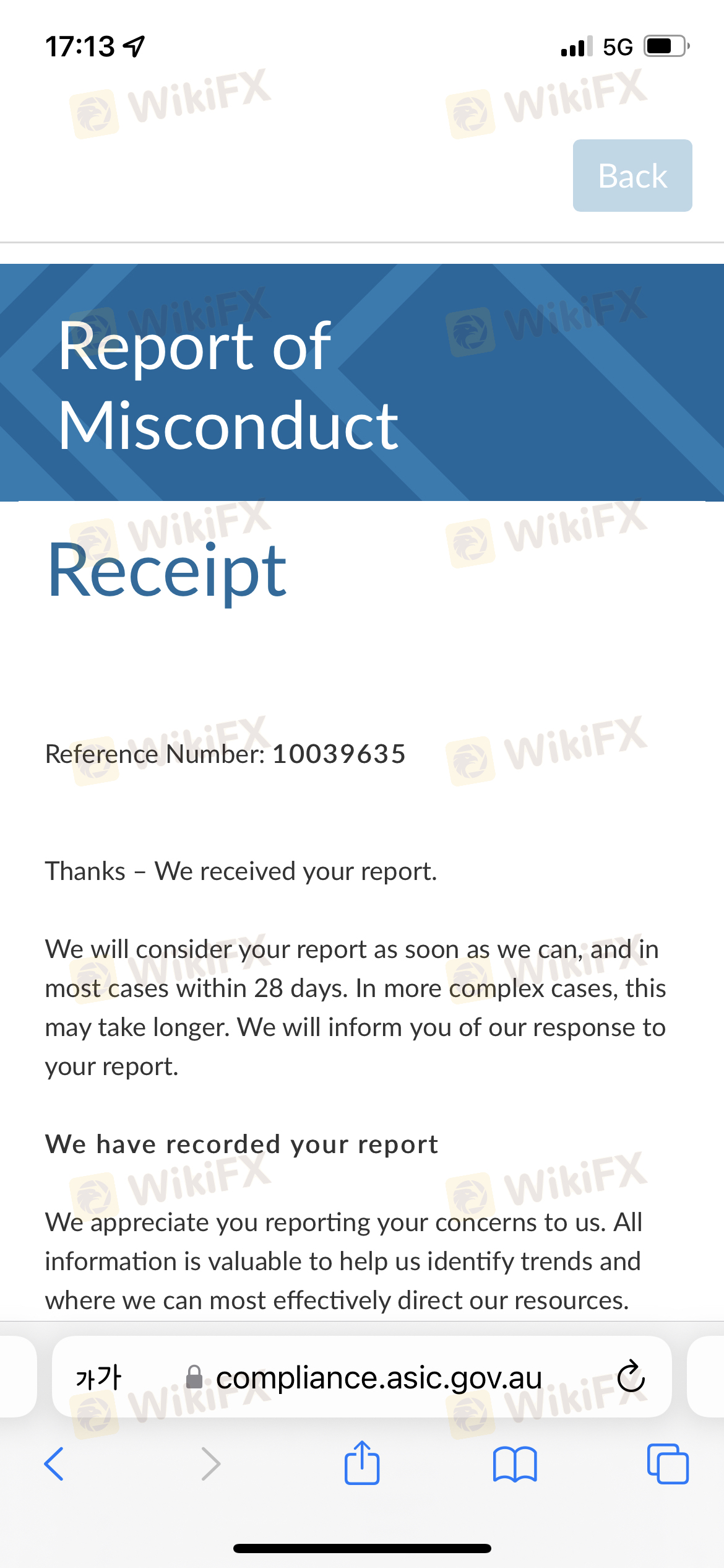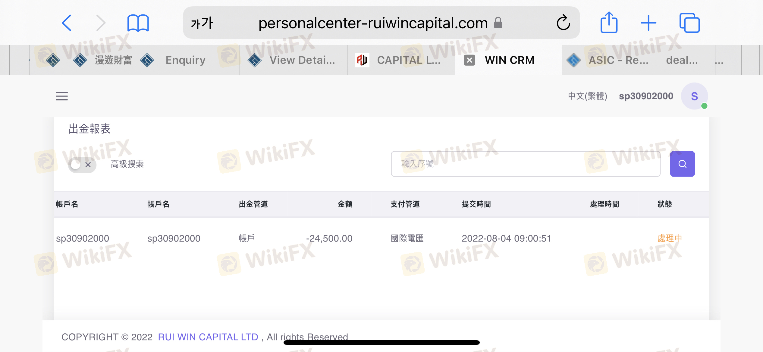 RUI WIN CAPITAL 中有兩個 URL。 URL 不同,但頁面完全相同。我不知道為什麼有兩個網址! https://ruiwincapital.com https://ruiwinaa.com 7月30日星期六提出一次,8月1日星期一修改,客服1-3個工作日內統一回复,然後按理說被記入時間還可以一次又一次地修改,也就是說沒有讓人撤退的意思!我查了天眼的平台,發現這家公司是有監管的。經8月4日查證,該經銷商不再受澳洲ASIC監管!後續還提到有60%的風險基金。這合理嗎?存錢後覺得dealer不行,想換,不能換嗎?我沒有提前提到這個,如果有人想存錢?這種不合理的條件!台灣和澳洲都已經報警了,但是台灣和澳洲警方都表示,本金很難追回來!也通知了澳大利亞ASIC,但沒有收到任何联系!目前只希望校長能被收回!